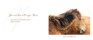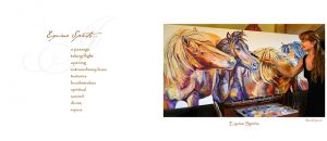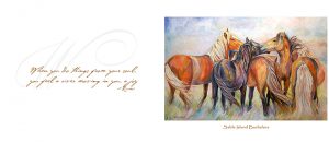 A laminated silk cover 8.5 x 10 which opens to 86 rich, artistic, creative pages featuring photographic impressions of the spirit of the wild Sable Island horses. Including paintings, b&w and color photography.