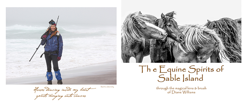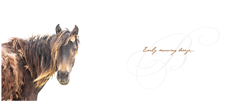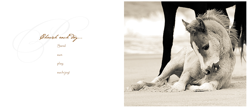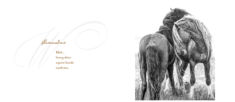 A laminated silk cover 8.5 x 10 which opens to 86 rich, artistic, creative pages featuring photographic impressions of the spirit of the wild Sable Island horses. Including paintings, b&w and color photography.